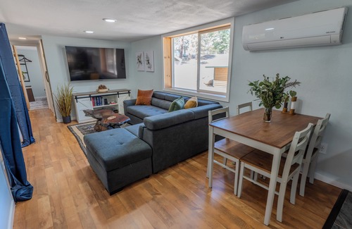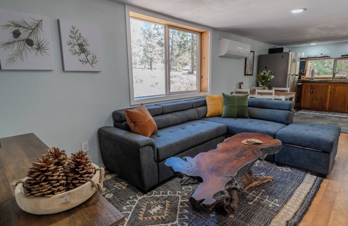 All amenities on Peppermint Falls Ranch are powered entirely by sustainable solar energy, including heating, air conditioning, and hot water. This cozy cabin offers serene forest views from the spacious, covered porch, perfect for sipping your morning coffee or relaxing at sunset. Inside, enjoy a modern yet rustic ambiance with handcrafted wood furniture, a king-sized bed with luxurious percale linens, and a comfortable living area where the sofa converts into a full-size hideaway bed. The fully equipped kitchen, complete with a live-edge countertop and coffee station, makes meal prep a breeze. Unwind in the beautifully designed bathroom featuring a waterfall shower and bidet for a spa-like experience. Whether you’re seeking a peaceful escape or a comfortable base for outdoor adventures, Pinecone Hideaway offers the perfect blend of comfort and style.