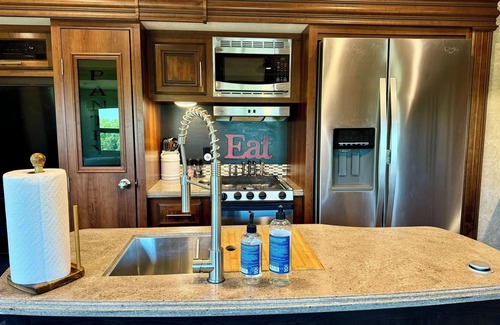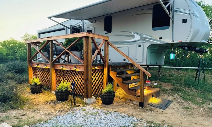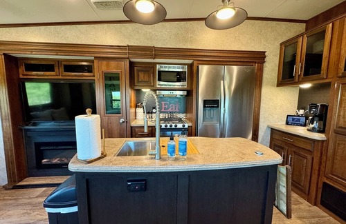This luxury 5th wheel is a unique & private retreat. Set by a pond and surrounded by trees you'll have the ultimate private destination for a relaxing stay. The stars at night are definitely big and bright out here. This RV is outfitted with a large kitchen, refrigerator, coffee bar & plenty of storage space. An elevated deck makes it a perfect place to unwind and take in the sights and sounds. Have an outdoor barbeque or soak in the hot tub & leave the hustle and bustle of city life behind.