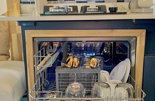 Inside, you'll find a queen-size bed, a comfortable living area with a futon, and a modern bathroom featuring a shower and bidet. The space is outfitted with all the essentials, including a marble-top kitchen, washer and dryer, WiFi, air conditioning, and heating—ensuring you enjoy both rustic charm and modern convenience.