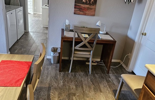 Contactless check in guest house on lower level of property with private driveway and entrance. Outdoor seating area with panoramic views of the red rocks with gas BBQ for dining outdoors. Apartment has a full kitchen, pantry, living room, laundry and private bathroom with walk in shower.