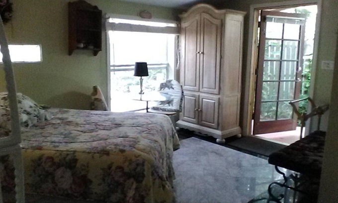 Come and go as you please in this stand-alone cottage with a private entrance and off street parking. Our modern yet cozy cottage features 260 sq. ft. of modern air conditioned living space consisting of a large granite bath with walk in shower and one room that is comprised of a double bed, dining table for two and a granite top efficiency kitchen with double sink, full size refrigerator, electric range and microwave. The room also has a high definition TV and the use of free Wi-Fi.