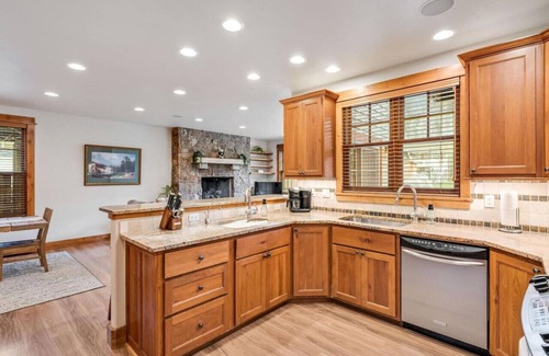 The main living area is open and inviting, with plenty of space for everyone to relax and unwind. The living room boasts a cozy fireplace and comfortable seating, perfect for snuggling up on chilly mountain evenings. The kitchen is fully equipped with everything you need to prepare delicious meals, including a gas stove, oven, refrigerator, and dishwasher.