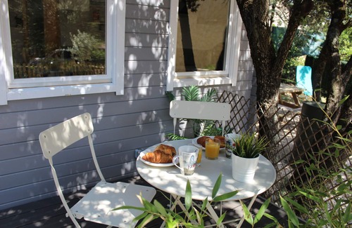 On the pretty wooden terrace, a table and two chairs are installed to allow you to take your coffee in the sun.
