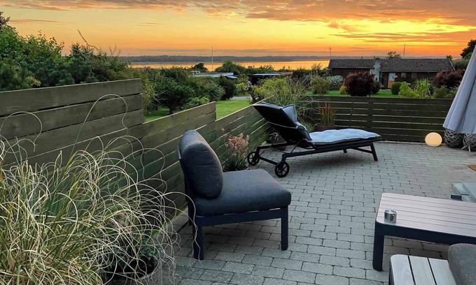 The beach is only 250 meters away, and due to the house's location 21 meters above sea level, there is a beautiful west-facing view of the fjord, where you can sit on the terrace or lie in the hammock and enjoy the most fantastic sunsets.