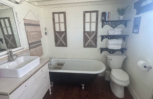 With just under 200 sq. ft. of cozy indoor space and 550 sq. ft. of outdoor living on our 35-acre estate, this is the perfect getaway. Unwind in the cast iron tub, sleep soundly in the loft & enjoy the comfort of heated floors. Step outside to the Trex deck patio, dip into the 8-ft. stock tank pool, or simply relax in nature’s embrace.