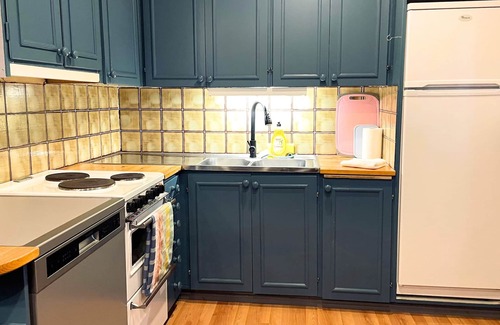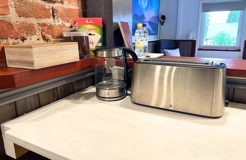 The kitchen is equipped with an oven, a stovetop, and a refrigerator, as well as a coffee maker, an electric kettle, and a lobster pot. Bathroom amenities include a hair dryer, towels, and toilet paper. Other amenities include bed sheets, heating, and a dining table.
