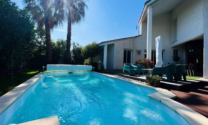 Accommodation: My highlights: air conditioning, 5 minutes from the beaches and 20 minutes from Montpellier, quiet residential area, secured private swimming pool, wooded garden, wifi, south exposure,...Ideal for a family getaway to the sea, this beautiful villa of about 165 m2, with careful decoration, can accommodate up to 8 people. It benefits from all the comfort to ensure you a stay dedicated to relaxation. On a contemporary garden of 400m2, it has a swimming pool (secured by an electric roller shutter), from 1m10 to 1m45. The kitchen is equipped with everything you need to prepare delicious meals and includes an oven, microwave, coffee maker, American fridge/freezer and dishwasher. You can also use the barbecue. The spacious dining room can accommodate up to 8 guests. A flat-screen TV and reversible air conditioning are available. This villa in a very residential area also has 3 beautiful air-conditioned rooms (with double bed 160cm) and a cabin with 2 bunk beds (not air-conditioned), the upper bed being not suitable for children under 6 years (Article 6 of Decree No. 95-949 of 25 August 1995). It has many storage spaces. There is a bathroom on the ground floor and a bathroom upstairs. Separate toilets are present on both levels. You will of course enjoy the beautiful garden, its swimming pool with its private terrace which is equipped with a garden furniture.Wash Linen is available in the house. Pets are not allowed in this house. Swimming pool dimensions: 7m x 3,50m - depth: 1m10 to 1m45Please note that the price does not include the rental of sheets and towels and that the cleaning of the end of stay is at your expense.A deposit of 500€ for the cleaning and 2000€ for the villa will be requested upon arrival (sums not collected or debited, as a guarantee).Free parking spaces are available right in front of the villa. You can enjoy a wide range of water sports, such as wake board, windsurfing and water skiing, just 2 steps from the villa. At less than 2 minutes, golf enthusiasts can enjoy the golf course with 2 18-hole courses and 1 6-hole course, for which you will benefit from 20% discount on green fees on presentation of your rental contract. In addition, you will find local shops, restaurants and bars in the port area. In the heart of a privileged setting in a relaxing atmosphere, you will discover an ideal space for a successful holiday. La Grande Motte offers you the sweetness of the farniente on the sandy beach nearby, or in the middle of a remarkable flora. Athletes of all kinds will enjoy the offer of activities on site or nearby: swimming, water sports, horse riding in the Camargue, canoeing. History enthusiasts will discover Arles and the Saintes-Maries-de-la-Mer, with their rich past. The warm Languedoc country will take you in its ferias and its many leisure parks. Within the Petite Camargue, the surprising Languedoc coast and the warm hinterland are waiting for you.All trade and services are nearby. Health: Pharmacies, dentists, nurses, physiotherapists. Hospitals and clinics in Montpellier. Food: Superette- grocery store at 5 minutes, Supermarkets, bakeries, restaurants, markets. Others: Service stations, bar-tobacco, post office, hairdressers, and many shops on the seafront. PASS LOISIRS is a realPassport Privilege forleisure and sports activitiesThe Big Motte!Your host offers it to you!From the first activity purchased, you get discounts on land and water activities. Valid for the whole family (5 people max) during your stay.List of activities: https://www.lagrandemotte.com/pass-loisirs-liste/