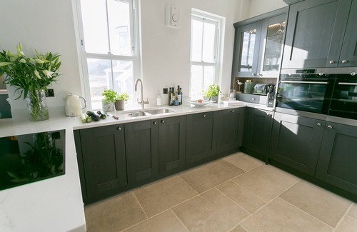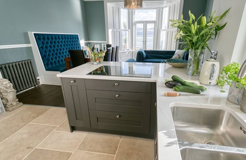 The rather grand front door, which stands proudly behind wrought iron railings, leads through the vestibule. On into the amazing open plan kitchen, dining and living area – this large space is flooded with light reflecting in from the sea beyond. This is where you'll spend most of your time, eating and socialising or just devouring the views through the bay french windows. The fitted kitchen has an induction hob, oven, dishwasher, large American fridge-freezer So well equipped for creating wonderful feasts and quick bites alike. A large dining table with bench and chairs stand alongside cosy teal velvet sofas. This room is a perfect place for all the party to congregate and make memories.