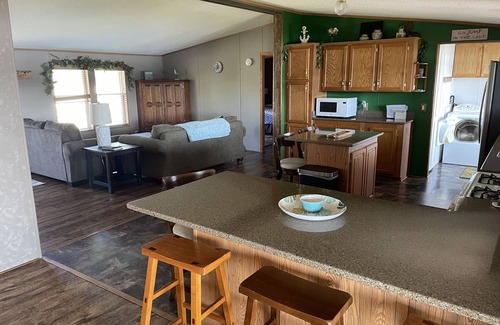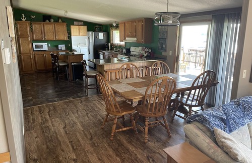 Inside the cottage is an open concept ranch style layout with plenty of room to settle in and stretch out. There are 2 living room areas with couches and TV's in each. A very well supplied kitchen with lots of counter space, an island and large breakfast bar counter area are next to the dining room. The dining room table seats 6-8 with 4 more seats at the breakfast bar right next to it. There is a sliding glass door going to the covered deck from the dining room and another deck access door off of the kitchen. Good views of the yard and lake from inside the house!