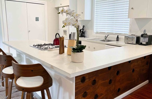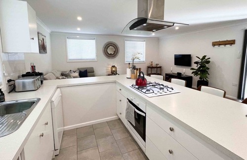 Creek View Cottage is all on one level. There are two bedrooms, each with a queen bed, and a spacious bathroom with a walk-in shower. The open plan living area includes dining table, living area with a comfy sofa and a smart TV. The well equipped kitchen includes an oven, microwave, dishwasher and coffee machine that is compatible with Nespresso pods. There is also a washing machine, dryer, iron and ironing board for your use.