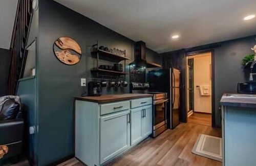 The cabin features a loft upstairs that has a queen bed and a bedroom downstairs also with a queen bed. The downstairs has a living room with a wood burning stove, dining area, kitchen and bathroom with a shower.