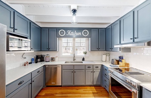 The home showcases a modern farmhouse aesthetic complete with recent upgrades and improvements designed for full family comfort. Lofty ceilings and strong natural light frame the living area, with plush seating, a smart TV, and a wood stove setting the scene for group gatherings. Gleaming countertops and high-end stainless steel appliances fill out the impressive full kitchen. Meals and game nights can be enjoyed around the large dining table. The furnished sunroom offers a cozy spot to kick back with your favorite book.