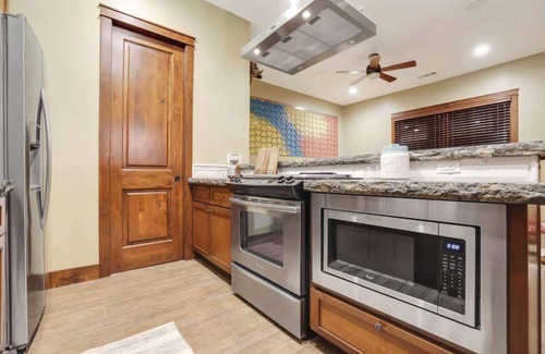 This vacation rental is actually the guest house to a primary residence on the property, but doesn't feel like a guest house at all. Up a flight of stairs, you'll find a luxurious designer loft, fit with a fully appointed kitchen, large pantry, spacious living room, and gorgeous bedroom, with beautiful views out every window. The fire pit is set up just for guests, and is the perfect place to relax and gaze up at the stars. Downstairs, there's a great covered patio that faces the creek, a sitting area, and washer and dryer.