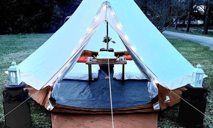 Nestled beside our seasonal running creek and organic vegetable gardens, this tent offers a peaceful escape for up to 4 guests. Inside, you'll find two comfortable twin-size air mattresses, with an option for an additional air mattress or sleeping bags upon request.