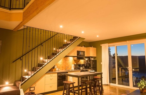 The Spruce Suite is 1200 square feet over 2 levels and has 3 decks (2 on the view orientation, 1 is the entry patio), may sleep up to 6 people (king bedroom and a queen sofa-bed on the entry level - queen bed and a double sofa-bed on the loft level - queen-sized, inflatable, travel bed that, when used, is set up in the loft level), has a fully equipped kitchen and a BBQ, a main (4-pce) bathroom with a dual-head shower and an air-jetted tub, a powder room (2-pce bath), Wi-Fi, Home Mini, TV, Satellite, DVD Player (about 150 movies are in the Library), etc. etc. and there are guest use laundry facilities.