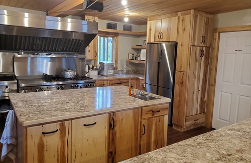 The Lodge has many places to gather - the great room, the game room, the library, the dining room, the wrap around deck, and of course the kitchen. The kitchen is our fan favorite feature - absolutely amazing with lots of space, huge stove and a very fast commercial dishwasher. The kitchen has roll-up shutters to provide separation, or leave it open to the dining room for a more open engaged feel. There's also a BBQ and Traeger smoker on the deck and a firepit for roasting hotdogs or marshmellows.
