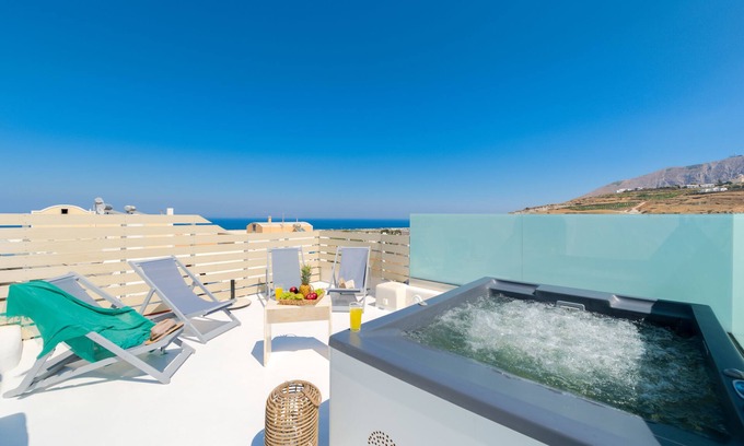 Our accommodation is split into two seperate cycladic houses, thoughtfully designed with your comfort in mind. Both boast an outdoor Jacuzzi with a sea view on their terrace. Ready, for a rejuvenating soak? You'll find everything you need for a pleasant stay, including free Wi-Fi coverage, air-condition and free adjacent parking.