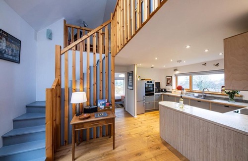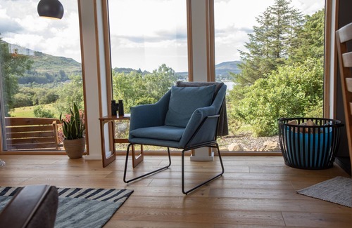 Luxury, modern larch wood house, 4 miles from Portree with stunning Loch and Cuillin mountain views. Perfect for up to 4 people with 1 ground floor king bedroom, 1 twin bedroom on the first floor, 2 lounge areas & 2 bathrooms.