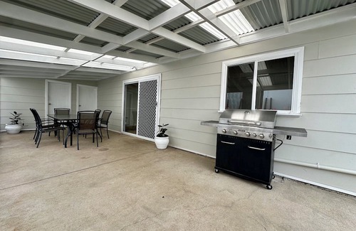 Secure backyard with a covered entertaining area, outdoor setting & BBQ
