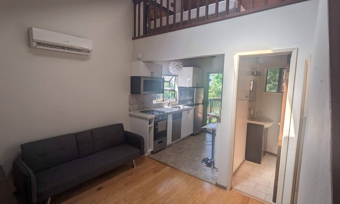 Cute cabin in the Santa Cruz Mountains. Private deck, kitchen with stove, oven and fridge. Loft has a queen bed. Bathroom with shower. TV with streaming services and internet.