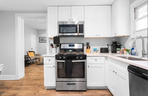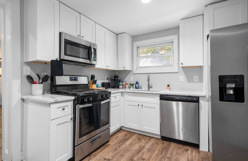 Welcome to your Atlanta retreat! This 1 bed, 1 bath apartment embodies the city's charm. Relax on the spacious porch, work in the dedicated space, and cook in the full kitchen. There is a spacious living area with smart TV and smart TV also in the bedroom. Centrally located, 10 mins from the city, walk to downtown Hapeville's dining and breweries. Close to the airport, Porsche, and film studios, it's ideal for work travelers needing a month-long stay in Atlanta.