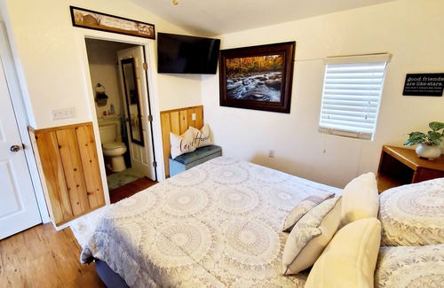 This is a guest house about 100ft from our residence. We live in the country with chickens, ducks and dogs. It's a quiet, peaceful place. We are on 6 acres and the yard is beautiful with a hot tub, fire pit and lots of recreational areas. A great relaxing get away but not too far to accommodate a your city needs.