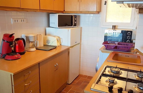 Living room with equipped kitchen: 4-ring gas hob, combined fridge-freezer, microwave, mini-oven, washing machine, Senséo coffee maker, kettle, toaster, classic coffee maker, small household appliances... table with 4 chairs, sofa bed, flat screen TV.