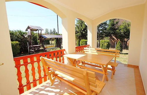 Balatonmáriafürdő 20 km from Keszthely: Beautiful, comfortable semi-detached house, 2 storeys. In a sunny position, 150 m from the lake, 1 km from the beach. For shared use: garden 300 m2 (fenced), lawn for sunbathing. Children's playground (swing). Private: barbecue. In the house: WiFi. Grocery, restaurant, grass beach 150 m. Well-known lakes can easily be reached: Hévíz Thermal 25 km. Please note: railway line closeby.