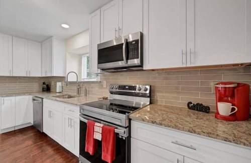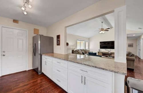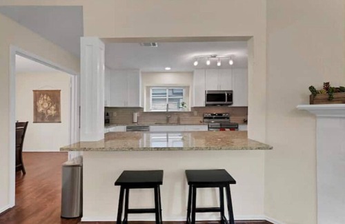 Beautifully remodeled 4 bedroom home in Mesquite, borders Dallas. The newly remodeled kitchen includes new stainless steel appliances, granite countertops, new cabinets, and it fully furnished. The open living room includes new furniture and a 65" smart TV. The four spacious bedrooms offer nightstands, dressers, and closets in each bedroom. The primary bedroom has a king bed, ensuite bathroom, and desk with chair for those who need to work while they play. All 3 secondary bedrooms have queen beds. The bathrooms are both updated with clean showers and granite countertops. The backyard is fully fenced with a wood privacy fence and is great for kids and pets. Guests will enjoy the entire home, including the 2 car garage and rear entry driveway.