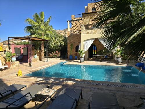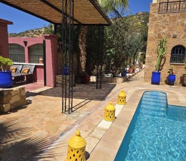 Providing a garden, Dar Farah provides accommodations in Elma. This villa offers air-conditioned accommodations with a balcony and free Wifi. During your stay at this villa, you can use an outdoor swimming pool, as well as a selection of a solarium and a shared kitchen. Offering a terrace and mountain views, the spacious villa includes 5 bedrooms, 3 living rooms, satellite flat-screen TV, an equipped kitchen, and 5 bathrooms with a walk-in shower. Towels and bed linen are offered in the villa. There's also a seating area and a fireplace. Buffet and continental breakfast options with local specialities, fresh pastries, and pancakes are available. Guests can also relax in the shared lounge area. Golf Tazegzout is 11 miles from the villa, while Amazighe Heritage Museum is 12 miles away. Agadir–Al Massira Airport is 22 miles from the property, and the property offers a paid airport shuttle service.