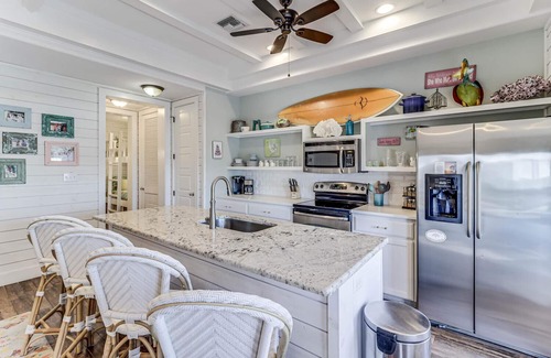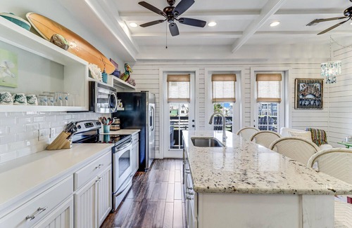 This fabulous condo at Cinnamon Shore is designer owned and decorated with so many light-hearted details! The entry hall porch has lifeguard chairs to relax and take in constant sound of the waves crashing. Upon entering this quaint condo, you are welcomed with warm, ocean-colored antique-inspired furniture and soft touches. A master bedroom features a king-size bed with a pillow-top mattress and luxury sheets, tons of storage, a private bathroom, and 42'' flat-screen TV. Open the windows and you can experience the sights, sounds, and scents outside right from the lofty bed! Built-in bunk beds hold two kiddos in the cleverly crafted hallway nooks, each with their own nautical lighting! The large, cozy couch and soft pillows in the living area invite your guests to relax while watching the 46'' flat-screen TV. The couch also folds out to accommodate two more! Enjoy preparing a meal for your family in the open, roomy, kitchen area. Take in more views of the Corpus Christi channel and fantastic South Texas sunsets through an entire wall of windows, or step out onto the balcony for some ocean air! Custom-finished shiplap wood siding on the walls makes this great condo special. Lots of storage space and upscale beachy and antique chic decor keep you comfy and feeling at home. The owner has included extras such as a Bose iPod playing station and a margarita machine! Cinnamon Shore's lovely amenities, including two fishing lakes, three fabulous swimming pools, the fine dining restaurant Lisabella's, Dylan's Coal Fire Pizza, and poolside C-Bar Cafe, and both boardwalks to the beach are all a short walk away from the condo. Come spend some time in our seaside community and enjoy the Serenity Found in this cozy home away from home!
