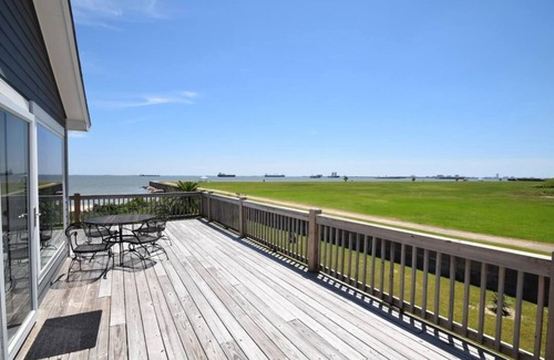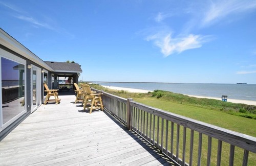 Davis Beach is a beautiful, 4 bedroom, 2 bath house located on the tip of Bolivar Peninsula, near the ferry and channel. You can sit in the living room or on the furnished deck and enjoy watching ships pass in the night. The quiet beach offers majestic sunrises and sunsets! This area is also a bird lover's paradise - you will not tire of seeing the many species of birds right in front of the house. This property sits next to the historic Fort Travis Park where you can enjoy a nature trail or explore the park.