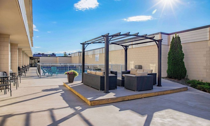 Recreational amenities at the hotel include a fitness center and a seasonal outdoor pool.