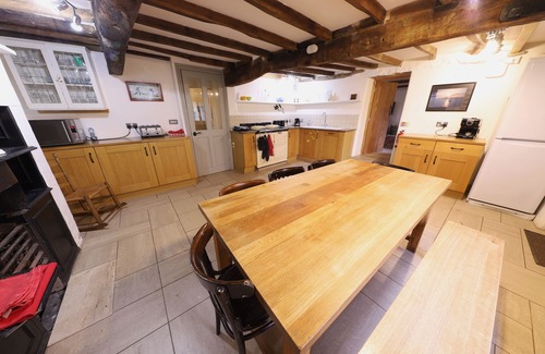 Large country dining kitchen with a tiled floor, original range open fire, dishwasher & an electric powers AGA.
