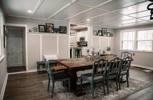 Create your memories here. This spacious 4 bedroom 3 bath retreat can serve as your vacation getaway. The over-sized farmhouse table expands to seat up to 15 and opens to the large living area. The front enclosed porch and the rear patio overlooking the 10 acre wooded lot and farm field can be the back drop to your family reunion, baby shower, bridal shower or corporate retreat. Our great room boasts a 54" Smart TV and hi-speed wifi access.