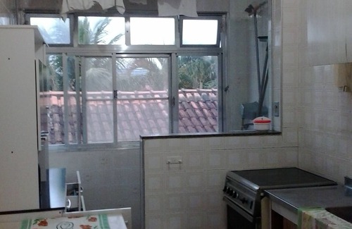 in the center of Bertioga State of São Paulo, defrente the beach, with two domitorio, a large living room and a bathroom a kitchen and laundry facilities, one of the two bedroom belichas, and the other a double bed in the room two protonas a large sofa and a bunk bed in the kitchen a sink, microwave, refrigerator, a table with eight banks with a closet, fixed and one mobile, stove with oven, we pans, dishes, cutlery garafa thermal