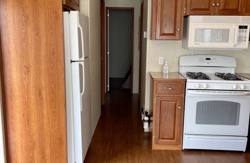 • A full Kitchen with Gas Stove, Fridge, Microwave, Small Appliances, Kitchen utensils, pots/pans and dishes.