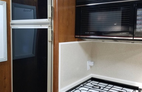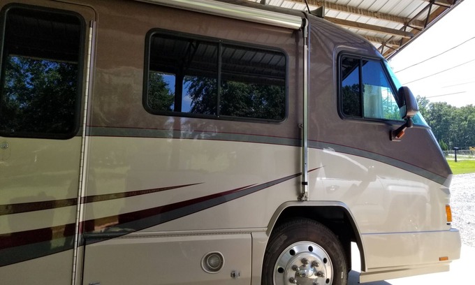 This motorhome is 36 ft in length and is parked under a pole barn next to our home. It has all the amenities of home to include double filtered water at the kitchen sink, new mattress & pillows w/protector, indoor shower and toilet, AC/Heat, surround sound, full size refrigerator, stove, oven, microwave, eating area, free Wi-Fi.