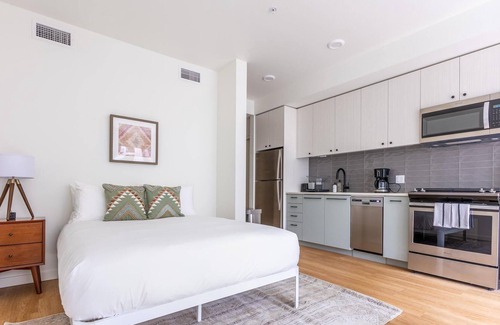 This stunning apartment is centrally-located in the Northwest District of Portland, making it a convenient space to live, work, and play. This walkable neighborhood features dining spots likeQueue Coffee,Please Louise, Breakside Brewery, and Sunshine Noodles as well as shopping atNew Seasons Market. Just a short drive away, you can reach even more retail destinations like Trader Joe's, REI, the Pioneer Place andPortland Hop Onshopping malls. Nearby green spaces include sprawling Forest Park and Trails, Overlook Park, andWallace Park. Bustling Downtown, the Portland Art Museum, The Freakybuttrue Peculiarium and Museum,Old Town Chinatown (which features the lively Saturday Market), and the famous landmark Powell's City of Books are all just 10 minutes away! You'll love this gorgeous studio's ideal location and many amenities, including its floor-to-ceiling windows, cozy bed, updated kitchen and bathroom, and on-site laundry.