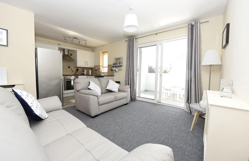 The spacious and bright living room has 2 leather sofas and leads onto a large south facing balcony. There is a wide screen TV with Freesat channels and Netflix. There is also a Bluetooth speaker so you can stream your favourite music from your phone.
