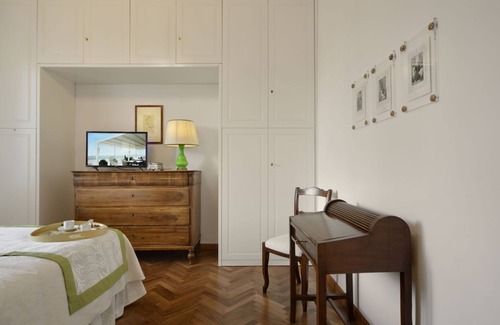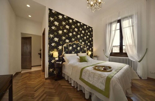 The “Nero su Bianco” deluxe room has pleasant views and parquet floors by Siam. Located on the first floor of the Villa, it has a bathroom with shower, antique Tuscan furnishings and features such as floral wallpaper.