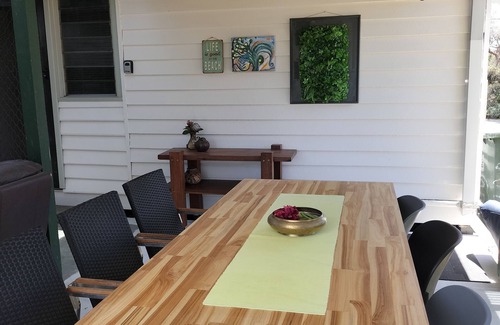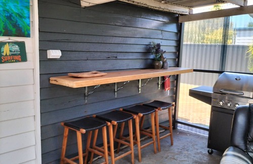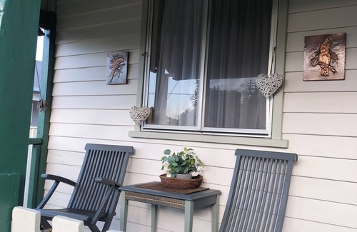 The house is self-catering, and the kitchen is very well-equipped. The house has a vintage bathroom – with a good-sized soaking bath and shower combination. Books, board games, a cosy wood fire, a reverse cycle AC, and a TV. All three bedrooms are roomy. The house has a quaint front verandah, a large rear patio and a secure backyard with ample uncovered parking.
