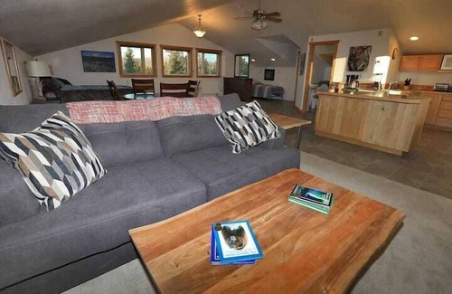 Open all year! Great Aurora Viewing!! Our 900sq ft luxurious upstairs studio suite is perfect couples (or couple with a child) who love their privacy and freedom on their Alaskan Adventure. This modern suite has lots of windows with amazing views, a King Bed, a twin day bed, full bathroom, full kitchen, dining area, sofa and the best private deck in the area.