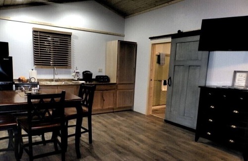 The Grizzly Cabin is one of several situated on our tranquil wooded acreage, all are studio style cabins themed after wildlife in Denali National Park, new and built this winter/spring. They are luxury with a touch of rustic, so whether you head down to Glitter Gulch to do some shopping, go out your cabin door on a wilderness hike, picnic by the lake, or right on your deck. BBQ (we supply the charcoal and propane), or sit by the fire ring (firewood provided) relaxing, roasting marshmallows making smore's (supplies provided in the pantry :)) We designed and built our cabins with your comfort and relaxation in mind,,,,, each cabin has 2 plush queen pillow top beds, therapeutic pillows (that won't give you a neck ache) ceiling fans when you want that slight breeze in your room, Italian Tile and hard wood flooring, nice dining room table to eat on and play games on, kitchenette's that have microwaves, refrigerators/freezers, keurig coffee makers, toasters, sinks, dish soap and kitchen towels also