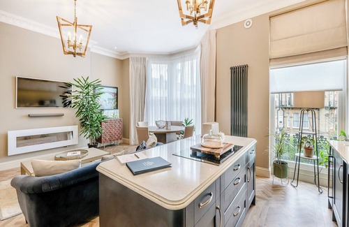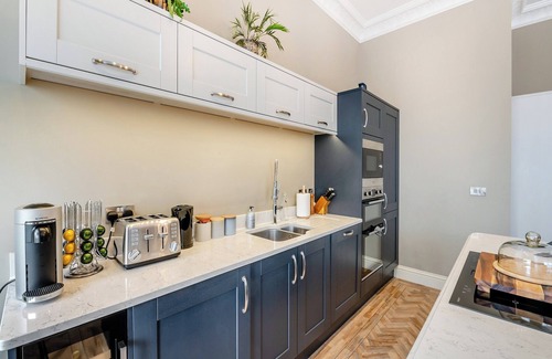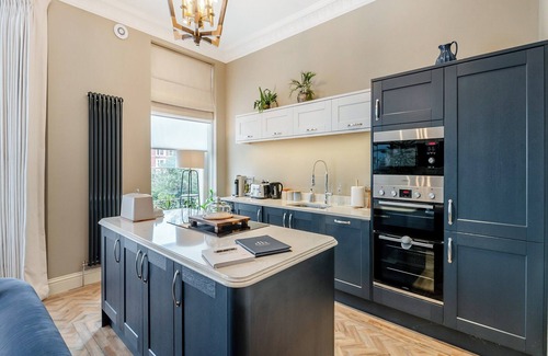 Bathroom: With shower over bath and toilet.. Gas central heating, electricity, bed linen, towels and Wi-Fi included. Welcome pack. Terrace with garden furniture. Permit parking for 1 car included. No smoking.. This exquisite period townhouse has undergone meticulous renovation to provide a refined base for coastal exploration. There is the option of a lift as well as the stairs up to this first-floor apartment. The apartment’s open-plan living area features a high-spec kitchen, fully equipped for culinary endeavours, complemented by a dining table for four and two plush sofas positioned around a 55-inch smart TV. Adding to the ambience, a feature electric fire and a captivating fish tank with colourful tropical fish create a welcoming and sociable space.