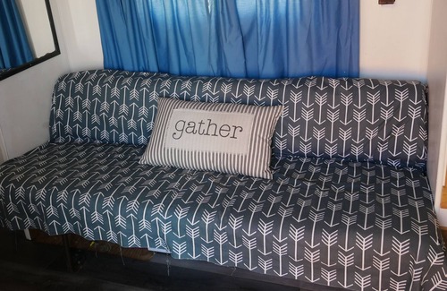 The Farmhouse Glamper is a Vintage trailer we took and remodeled together. It has a full sized bed, full bathroom, closet, pull out couch and Kitchenette with the Basics for cooking. Has a front yard sitting area with outstanding views of the Grand Wash Cliffs.