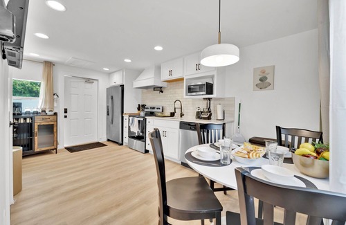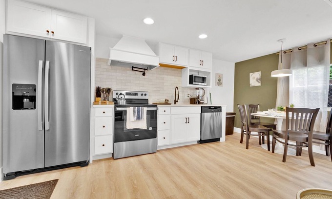 Our fully-stocked kitchen is a foodie's paradise, equipped with modern appliances including a spacious fridge with a freezer, Ninja blender, Insta-Pot, four-stove cooktop, oven, and dishwasher. Coffee lovers will appreciate our coffee station, and the toaster, cooking utensils, silverware, and dishes complete the ensemble for your culinary adventures.
