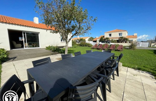 House in the Marais Breton, detached, located in a complex, with a view of the Bouin Wind Farm. Ground floor: living room/lounge/kitchen, 3 bedrooms with 3 single beds in each, 2 shower rooms/WC, garage (washing machines, dryers). Upstairs: Low mezzanine (ceiling height 1.65 m at the highest) with relaxation area. Wi-Fi. Landscaped grounds of 600 m² (garden furniture, barbecue). Oyster farm at Port de l'Epoids, bird watching in the Marais 500 m away. Passage du Gois 5 km away. Optional: End-of-stay cleaning: €120/stay; Sheet rental: €12/bed/stay; Towel rental: €8/person/stay.