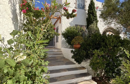 Our lone-standing house (snow-white walls, light-blue doors, windows and closets) was built in 2010. It is located on a slight slope above the harbour city of Skala with sea view to south and east. The house has 2 balconies on the upper floor, which offer a great view of the island and sea; with clear weather you can see other islands like Ikaria and Leros. On the ground floor you will find partially covered pergolas, equipped with a large dining table and seats, cushions and chairs. The house is surrounded by a nice garden on two sides. Loungers invite you to relax and sunbathe. There is also an outdoor shower. The location is very peaceful; there are a few other (holiday) homes around.