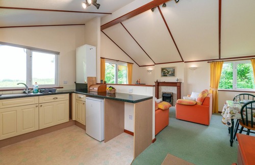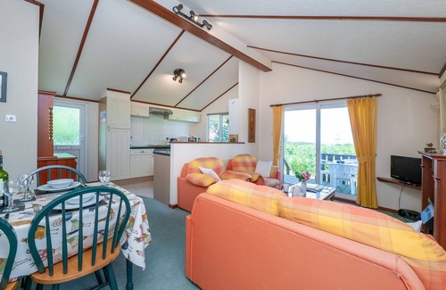 The comfortable lounge has two arm chairs to match the 2-seater sofa, a coffee table, a flame effect electric fire, and a 22 inch Flatscreen TV with built in Freeview and DVD player. Patio doors open onto a decking area with picnic table and chairs. This is a fantastic place to relax, unwind and admire the outstanding sea views.